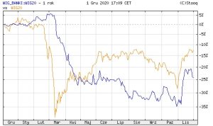 Kurs indeksu WIG Banki w porównaniu do WIG20 w ostatnich 12 miesiącach