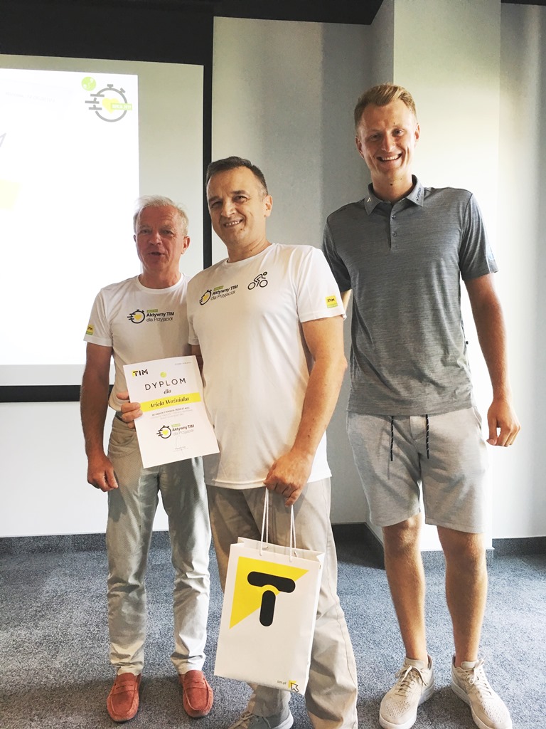 W obu rywalizacjach (na kilometry oraz na kalorie) bezapelacyjnie zwyciężył Ariel Woźniak (na poniższym zdjęciu w środku) z wrocławskiej centrali TIM-u (4250,51 km i 188.145 kcal). Na drugim szczeblu podium znaleźli się Michał Wiśniewski z Biura Handlowego TIM SA w Gdańsku (3206,27 km) i Marcin Wachowski – dyrektor Biura Handlowego TIM-u w Lesznie (117.108 kcal). Trzecie miejsca zajęli pracownicy centrali TIM-u: Jarosław Sawala (2758,33 km) i Grzegorz Adamczyk (113.126 kcal).