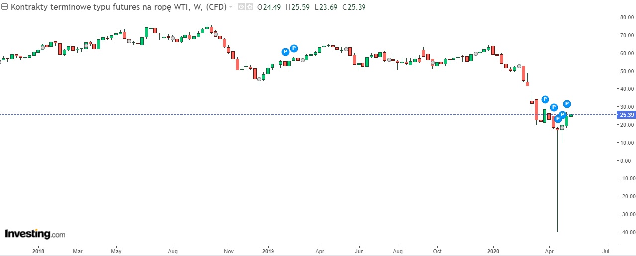W poniedziałek 20 kwietnia pojawił się jednak problem, bo okazało się, że o ile chętnych do pozbycia się kontraktów jest bardzo dużo, to nikogo nie interesuje ich kupno. Wybuchła panika, spychając ceny ropy w przepaść. Najprościej mówiąc, posiadacze kontraktów na dostawę ropy byli gotowi dopłacić, by ktoś je od nich odebrał.