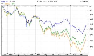 Obecnie w skład WIGdiv wchodzi ponad 30 firm z różnych branż. Tegoroczny spadek wartości ich akcji skutkował stratami wartości samego indeksu – od początku 2022 r. oddał on ok. 16% wartości. To jednak mniej niż główne wskaźniki WIG20 oraz WIG.