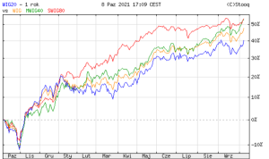 Informacjom Głównego Urzędu Statystycznego o najwyższej od ponad 20 lat inflacji w Polsce towarzyszą doniesienia o kolejnych wzrostach indeksu WIG na warszawskiej giełdzie. Na początku października pokonał on pułap 73 tys. pkt. – to jego rekord wszechczasów. Najwyżej od kilkunastu lat są również wskaźniki małych i średnich spółek (sWIG80 i mWIG40).