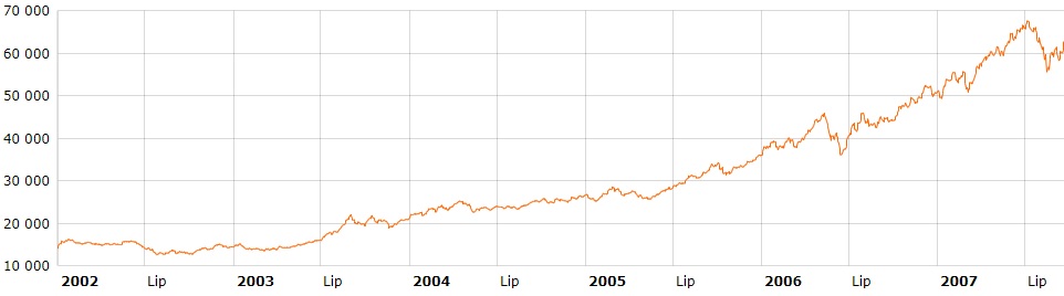 Najbardziej spektakularna hossa w historii warszawskiej giełdy zaczęła się, gdy inwestorzy otrząsnęli się po kryzysie dot-comów. Trwające mniej więcej od początku 2002 r. do lipca 2007 r. wzrosty wyprowadziły indeks WIG na historyczny poziom ponad 67,7 tys. pkt. Np. inwestor, który w 2002 r. kupił akcje KGHM po kilkanaście złotych za sztukę, 5 lat później mógł sprzedać je po ponad 130 zł. Opłacił się też chociażby zakup akcji PKN Orlen w 2002 r. za mniej niż 20 zł – w 2007 r. ich kurs przekraczał 50 zł.