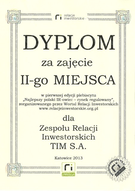 2. miejsce wśród spółek notowanych na rynku regulowanym. Wortal Relacji Inwestorskich www.relacjeinwestorskie.org.pl docenił internetową komunikację z inwestorami prowadzoną przez TIM SA: zarówno kanał na YouTube, jak i internetowy serwis relacji inwestorskich, a w nim – cykl „Cały ten rynek…”.