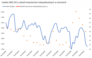 Rezultat na poziomie poniżej 20% w przypadku inwestorów indywidualnych po raz ostatni można było zaobserwować podczas spadków z 2019 r. Później, gdy po pierwszym szoku związanym z pandemią, rozpoczęła się nowa hossa, indywidualnych uczestników rynku zaczęło szybko przybywać. Na szczycie hossy ich udział w obrotach na parkiecie głównym GPW wyraźnie przekraczał 20%.