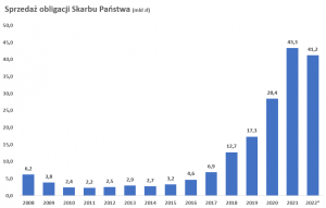 Dlatego właśnie Polacy masowo zaczęli kupować obligacje emitowane przez Skarb Państwa. Tylko w lipcu zainwestowali w nie łącznie ponad 10,3 mld zł, a w czerwcu – ponad 14 mld zł. Czerwcowy wynik to historyczny rekord. Wartość sprzedaży obligacji skarbowych po lipcu 2022 r. stanowi już 95% wyników z całego 2021 r.