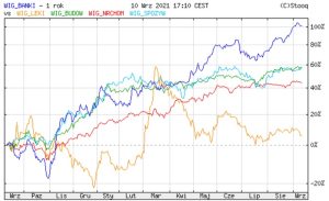 Powodów do niezadowolenia nie mają też posiadacze akcji spółek z branż surowcowej czy budowlanej. Np. wzrost cen stali wspomógł notowania producentów wyrobów stalowych – kurs spółki Stalprofil w ciągu roku zyskał ok. 100%. Z kolei branża budowlana rośnie m.in. na fali niesłabnącego popytu na rynku mieszkaniowym. Wskaźnik WIG Nieruchomości w ciągu 12 miesięcy zyskał ok. 50%, podobnie jak WIG Budownictwo.