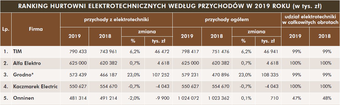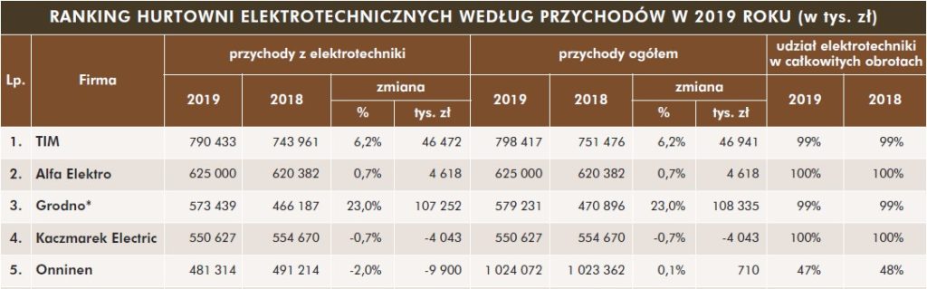W najnowszej edycji zestawienia „Hurtownie elektrotechniczne”, opublikowanego przez branżowy magazyn „Elektrosystemy”, TIM utrzymał pozycję lidera. Kryterium decydującym o pozycji w rankingu była wielkość przychodów z elektrotechniki, uzyskanych w 2019 roku.